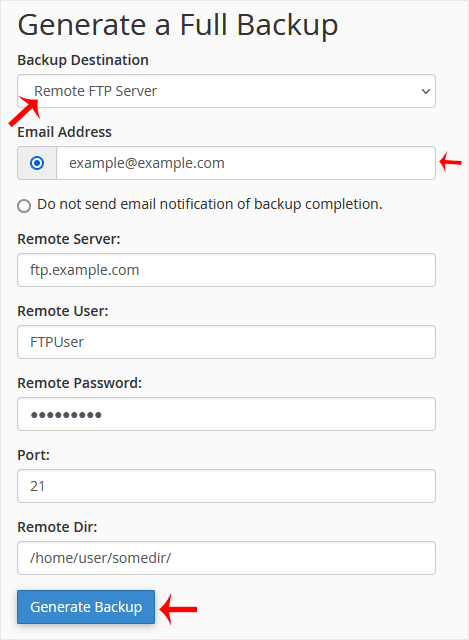 5. Depois de preencher os detalhes do FTP remoto, clique em Gerar backup .