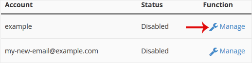 3. Na página do BoxTrapper, você vê uma lista de seus e-mails sob o cabeçalho Conta e o status do BoxTrapper sob o cabeçalho Status . Escolha Gerenciar . 4. Na página Gerenciar do BoxTrapper, se o status for Desativado , escolha Ativar